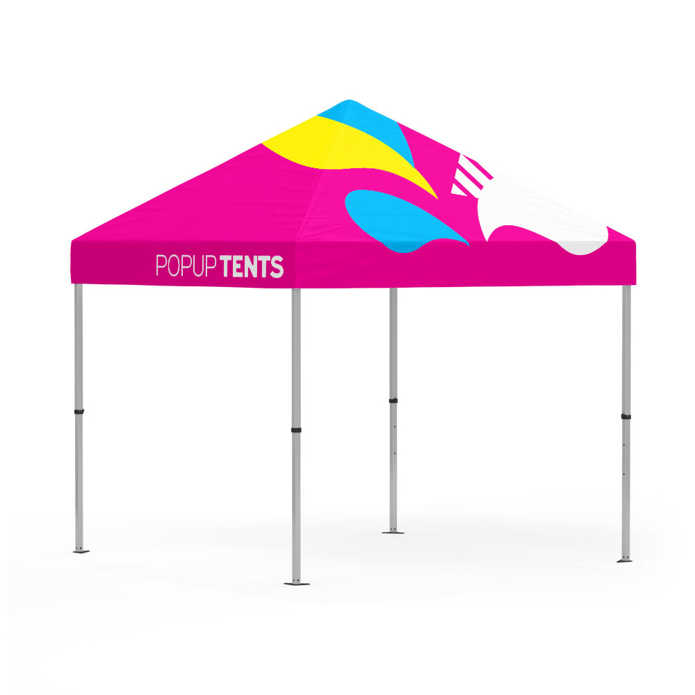 A custom pop up tent is a 10’x10’ shelter consisting of a custom-printed polyester canopy and a 1.6” thick aluminum frame. The aluminum frame easily expands and retracts, allowing quick and simple setup. The canopy rests on the top of the frame, providing shade and highly visible brand exposure. Any custom image or graphic can be printed onto the canopy, making it a great solution for advertising your business or organization. Your pop up tent can also come with additional accessories, including a premium carrying case, rope & stake kit, and set of four sandbags.